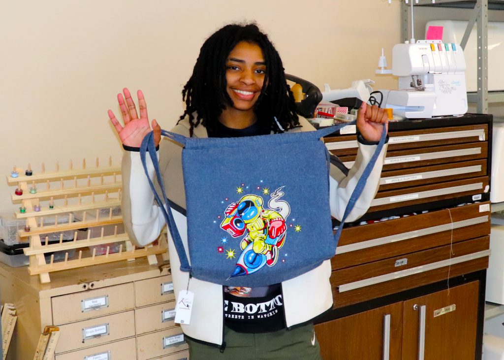 Aspiring fashion designers Dicey Lewis and Haze Ingram had their drawstring bags shown by fashion designer and bag creator Karen “Kema” Maxwell. Ms. Maxwell—owner of Kema’s Kreations—is the Global Fashion program teacher at the Capital Region BOCES Career and Technical Education (CTE) Center, where the two seniors are enrolled.