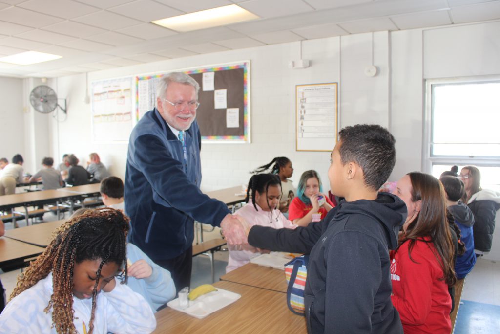 Mr. Bird ended his morning by visiting with the fifth graders during lunchtime before attending the assembly in the gymnasium.