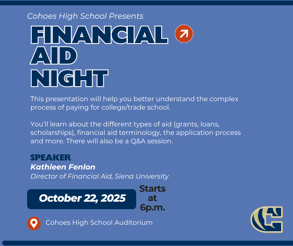If you have children who are planning on attending college or trade school after high school graduation, you won’t want to miss Financial Aid Night on Wednesday, Oct. 22 at 6p.m. in the high school auditorium.